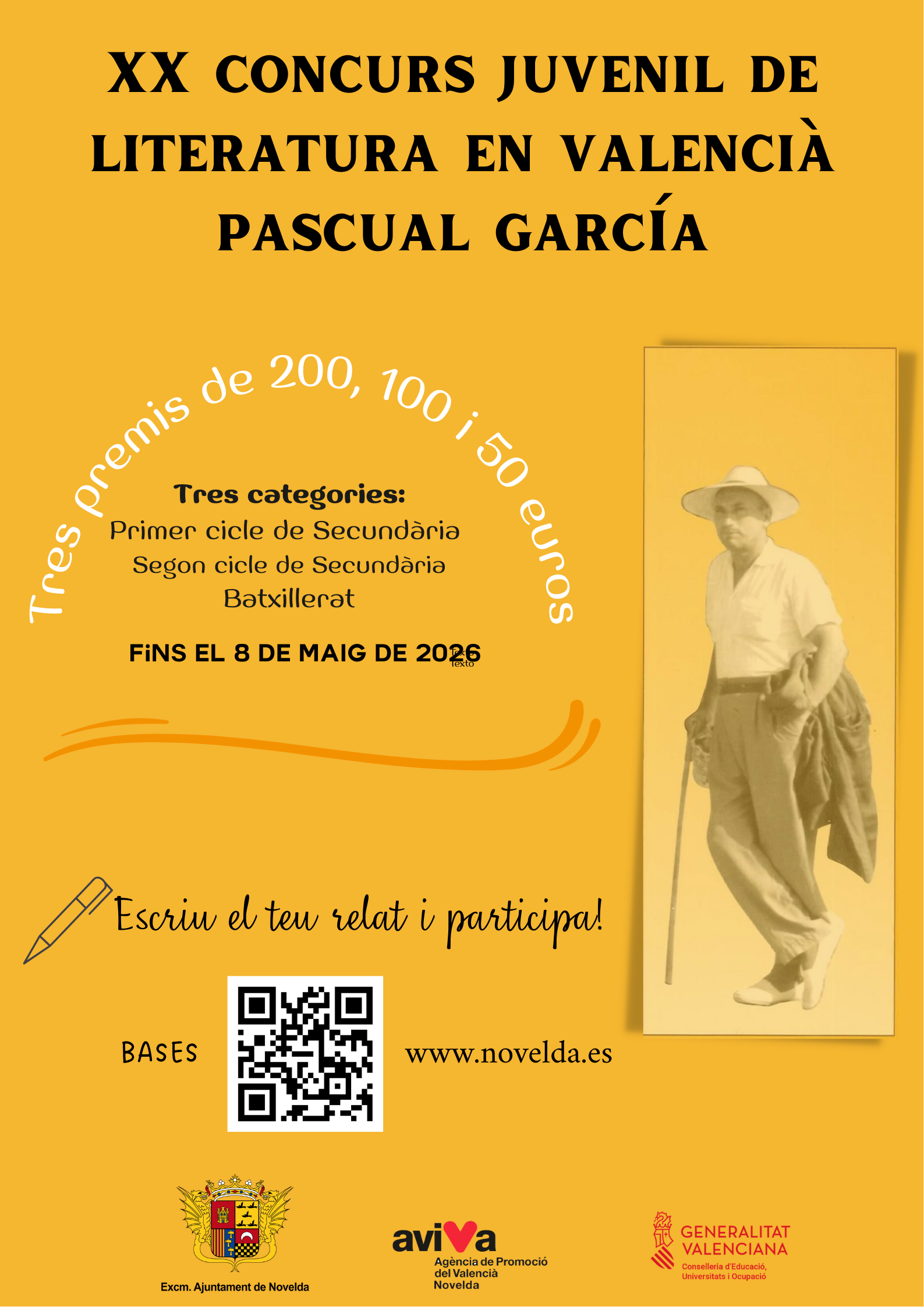 NORMALIZACIÓN LINGÜÍSTICA Normalització Lingüística convoca la vintena edició del certamen literari juvenil Pascual García Autor admin Fecha 17 marzo, 2026 La regidoria de Normalització Lingüística, a través de la Agència de Promoció del Valencià...