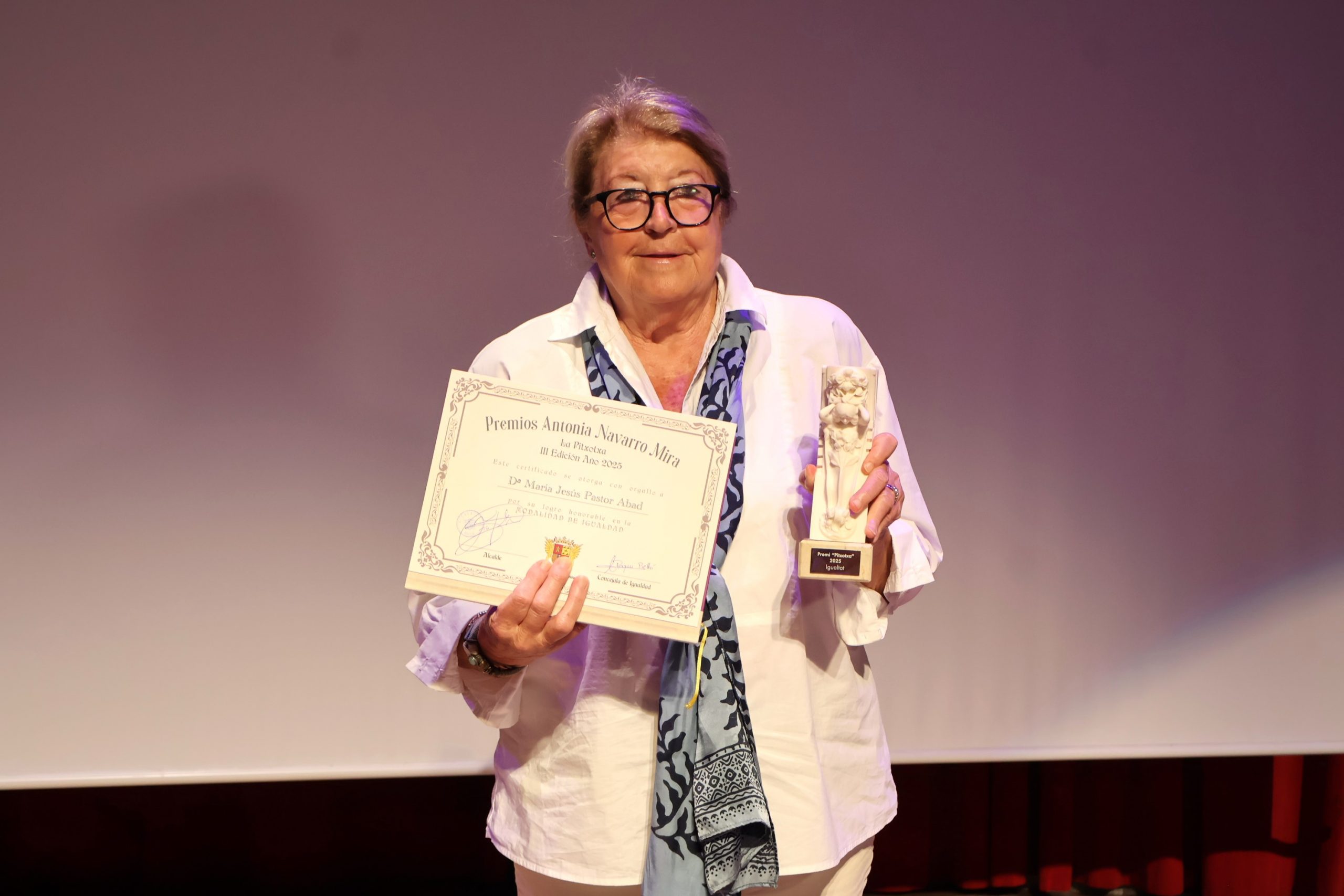 La concejala de Igualdad, Paqui Beltrá, que señalaba que los premios Antonia Navarro, son un “reconocimiento a la labor de aquellas personas, entidades e iniciativas que, desde diferentes ámbitos, contribuyen al progreso social, cultural económico y humano de nuestra ciudad y un homenaje a quienes con su esfuerzo y dedicación, continúan construyendo el futuro de Novelda, siguiendo los valores que La Pitxotxa representó: igualdad, innovación y arraigo con nuestra historia como comunidad”, fue la encargada de entregar a María Jesús Pastor Abad el premio en la categoría de Igualdad, reconociendo así la trayectoria humana y profesional de una noveldense que, además de ser profesora y procuradora y sentir una gran pasión por el conocimiento, la justicia y la familia, se convirtió en la primera mujer concejala en el Ayuntamiento de Novelda durante la primera corporación democrática que se constituyó el 19 de abril de 1979.