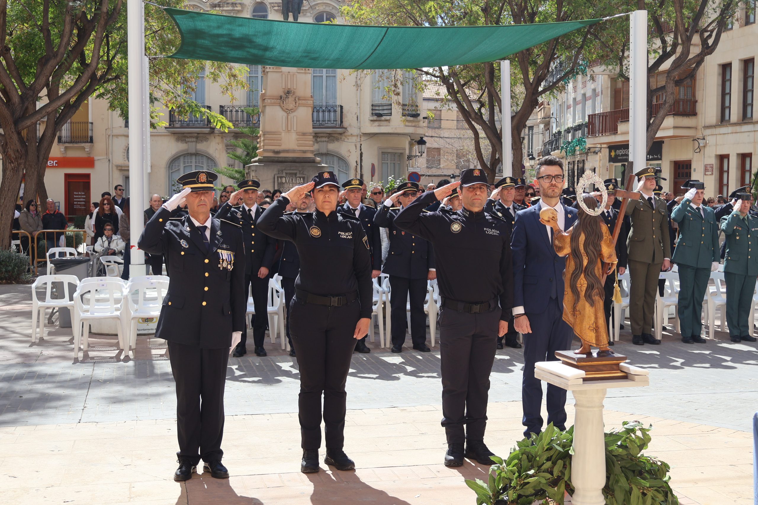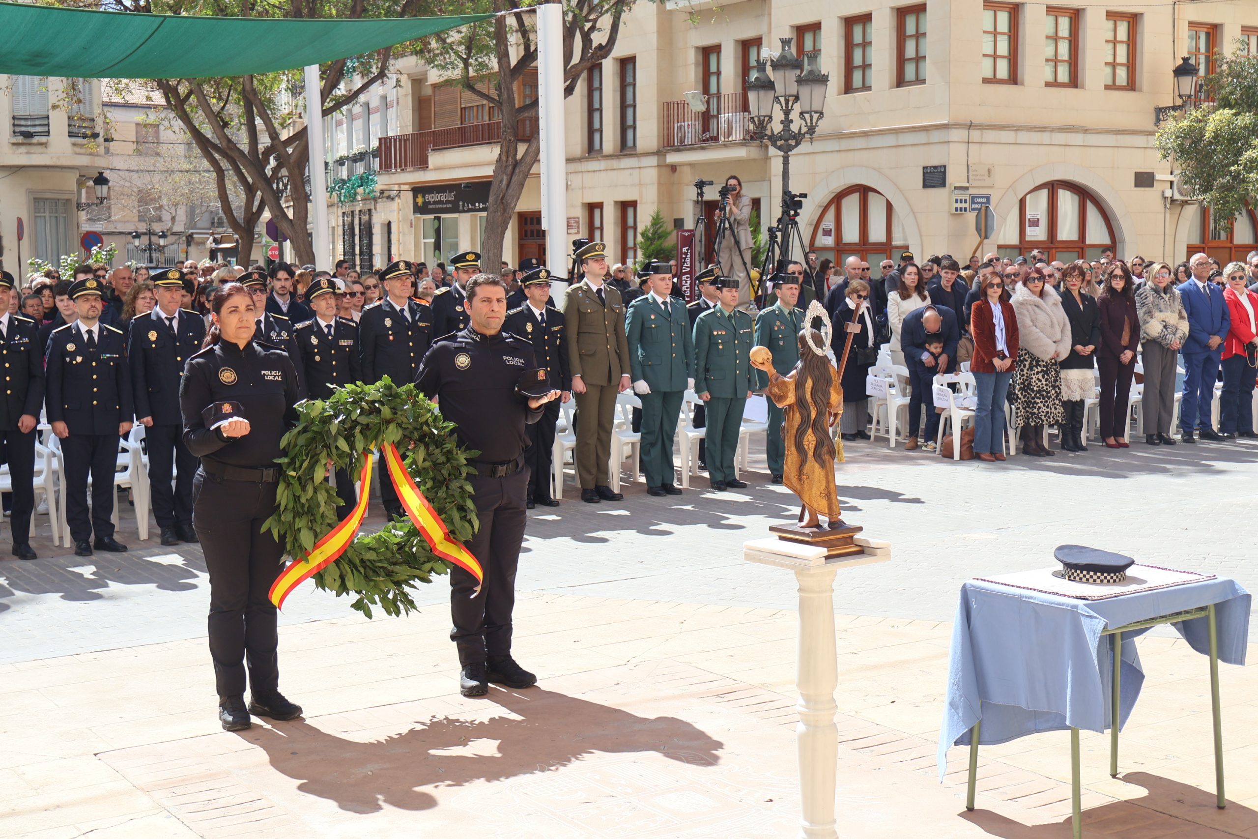 Durante la ceremonia, tras pasar revista a la formación policial y proceder al izado de banderas, se ha rendido homenaje a los agentes fallecidos, con la colocación de una corona de laurel a los pies de la imagen de Santa María Magdalena, patrona de Novelda, en recuerdo de todos los miembros de las fuerzas y cuerpos de seguridad que perdieron la vida en el ejercicio de su labor.