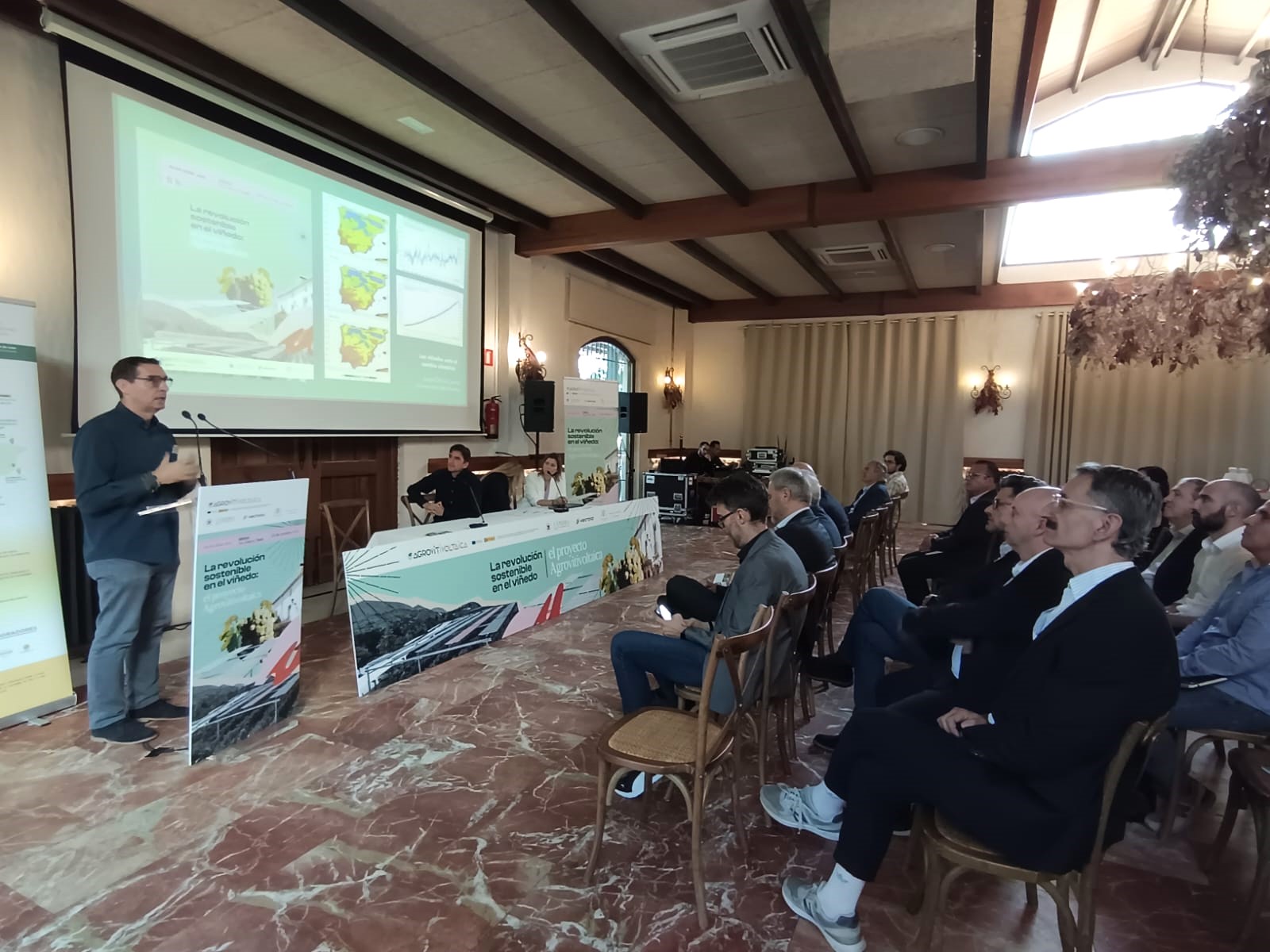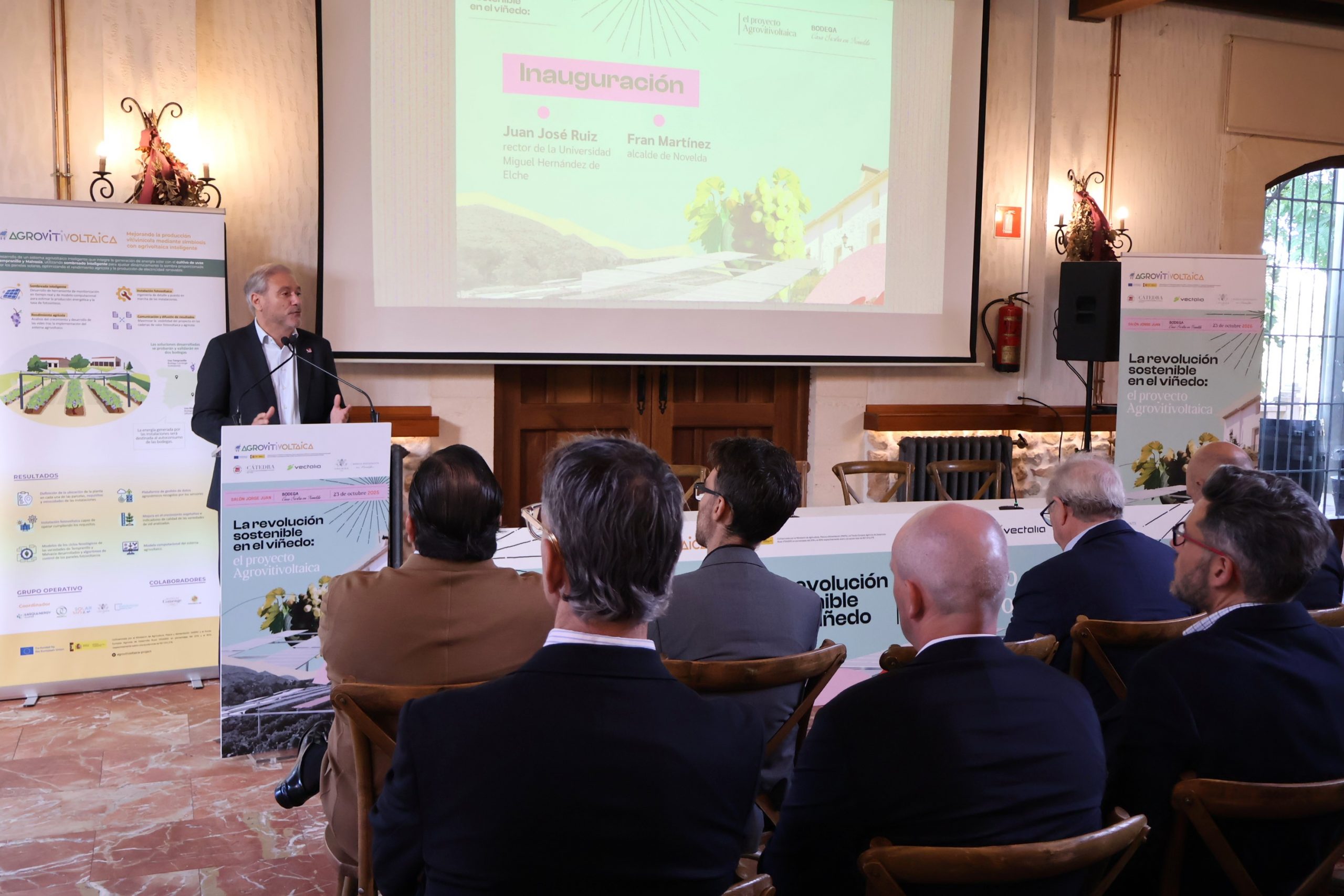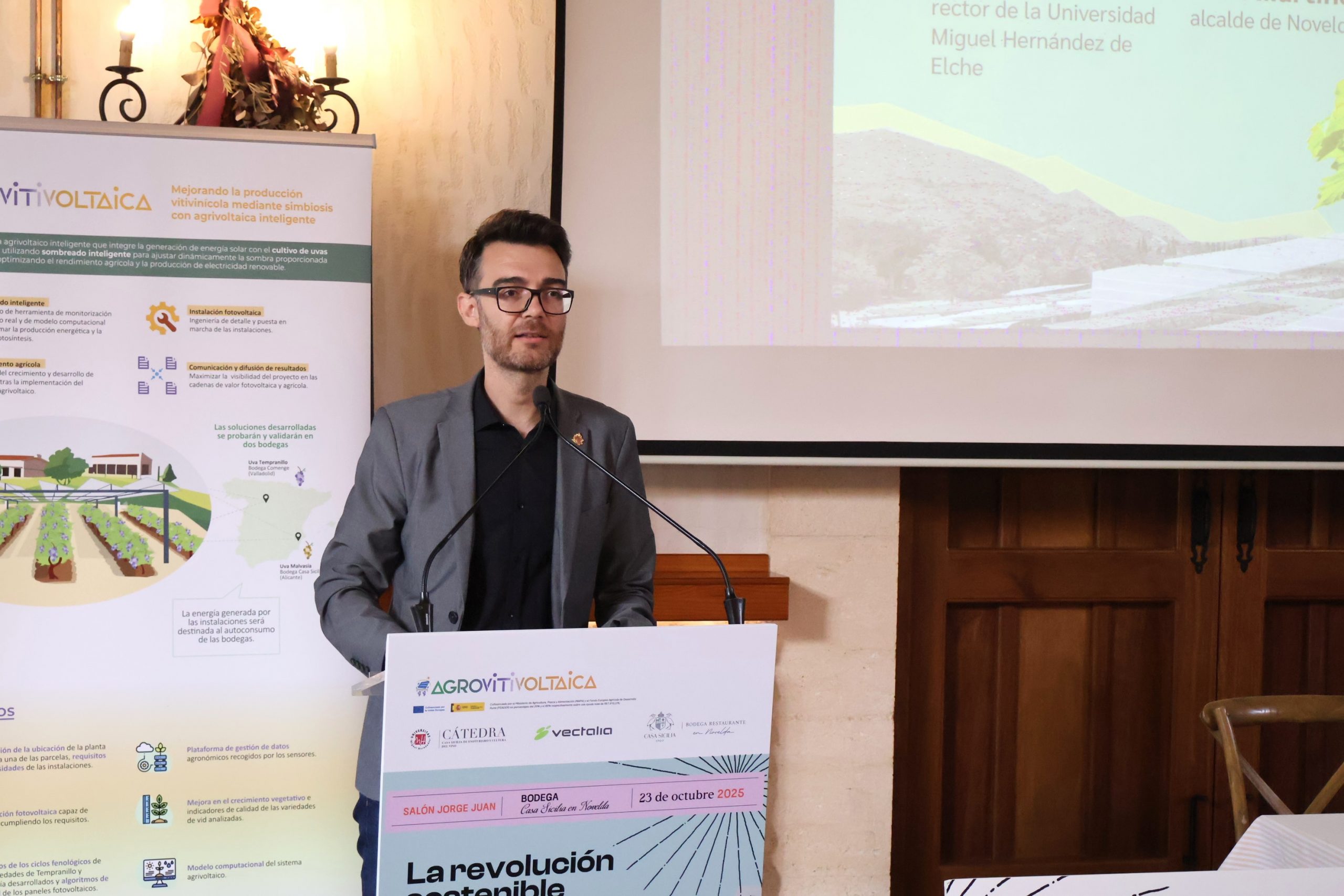 Fran Martínez, junto al rector de la Universidad Miguel Hernández, Juan José Ruiz, ha abierto esta mañana la jornada técnica que, bajo el título La revolución sostenible en el viñedo: el proyecto Agrovitivoltaica, se ha celebrado en las instalaciones de la bodega Casa Sicilia y en la que expertos y profesores universitarios han analizado una iniciativa pionera que busca la integración de la energía fotovoltaica en el cultivo de la vid, ofreciendo soluciones innovadoras y más eficientes, compatibles con la sostenibilidad del sistema.