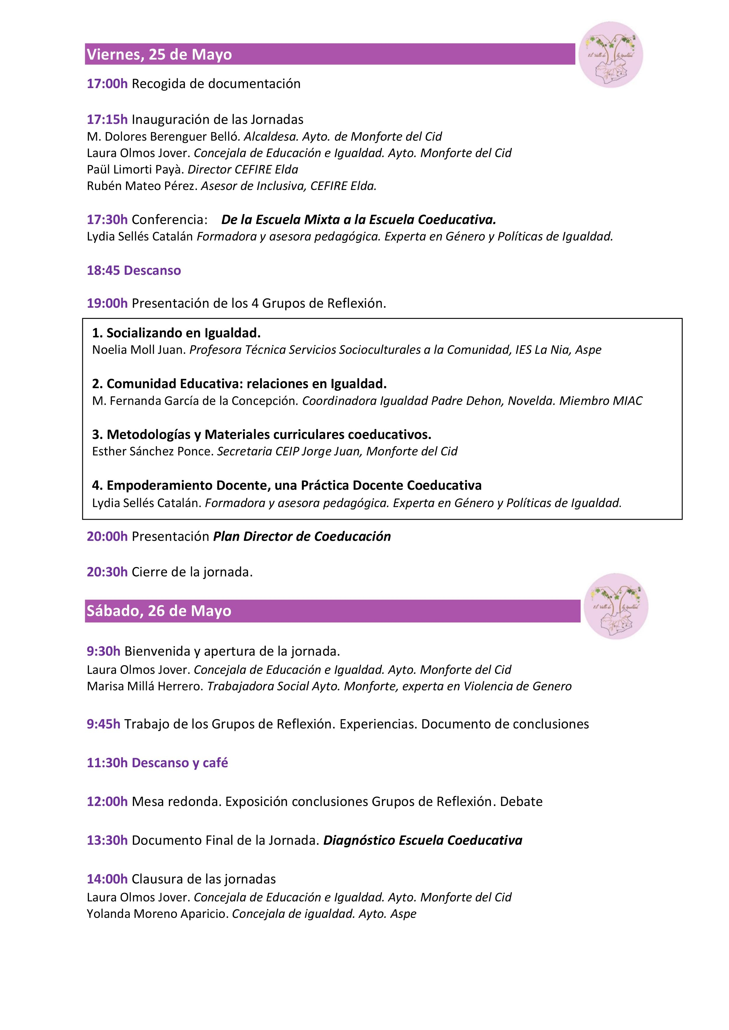 En el marco de este encuentro de trabajo está previsto que la formadora y asesora pedagógica, experta en género y políticas de igualdad, Lydia Sellés, pronuncie la conferencia “De la escuela mixta a la escuela coeducativa”, así como la presentación de cuatro grupos de reflexión sobre la educación en igualdad y la presentación del Plan Director de Coeducación.