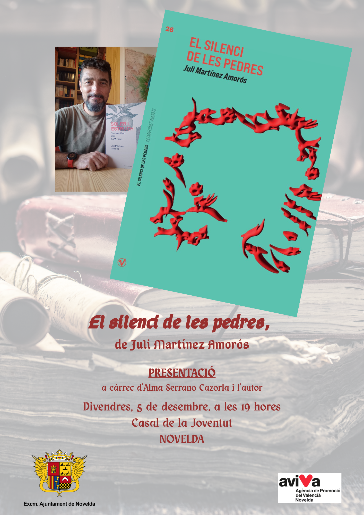 La Regidoria de Normalització Lingüística de l’Ajuntament de Novelda ha anunciat la presentació de El silenci de les pedres, la darrera obra del novelder Juli Martínez Amorós, que tindrà lloc divendres, 5 de desembre, a les 19:00h, al Casal de la Joventut.
