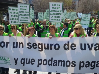 La manifestación ha denunciado, tal como señalaba en la lectura del Manifiesto el presidente de ASAJA Alicante, Eladio Aniorte, “la deriva a la que nos está llevando el sistema nacional de seguros agrarios español” y, en concreto, el aumento de las primas que “pone en peligro el cultivo por la imposibilidad de asumir el coste del seguro, lo que supondrá una menor contratación y, en consecuencia, muchos agricultores quedarán totalmente expuestos y desvalidos ante inclemencias metereológicas que arruinen la cosecha”, El colectivo de la uva de mesa ha lanzado “un grito unánime”, subrayó Aniorte, “por un seguro agrario justo, viable y que podamos pagar” y apeló a ENESA y Agroseguro a negociar las primas de los seguros para la campaña de este año.