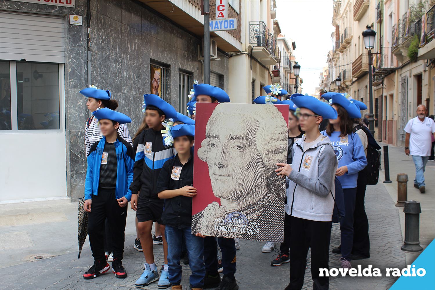 Niños y niñas con escarapelas y tricornios elaborados por ellos mismos, simulando la indumentaria que portaba el ilustre marino en el siglo XVIII, han recorrido la calle Mayor en un desfile en el que los centros docentes y la Asociación Capaz, junto a la comisión organizadora del 250 Aniversario de la muerte de Jorge Juan y Santacilia, han trabajado durante las últimas semanas y que sirve para acercar a los escolares la figura del científico, matemático, ingeniero naval, espía y marino nacido en Novelda en 1713.