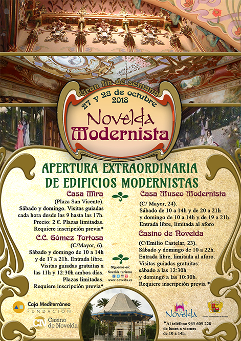 La apertura extraordinaria en fin de semana de edificios modernistas y la posibilidad de visitar la Casa Mira, de propiedad privada, son dos de los grandes atractivos de la segunda edición de Novelda Modernista, una iniciativa de la Concejalía de Turismo con la que, a través de un amplio programa de actividades que se desarrollarán el 27 y 28 de octubre, “se pretende dar a conocer y poner en valor el patrimonio local”, según señaló el concejal de Turismo, Francisco Sepulcre.